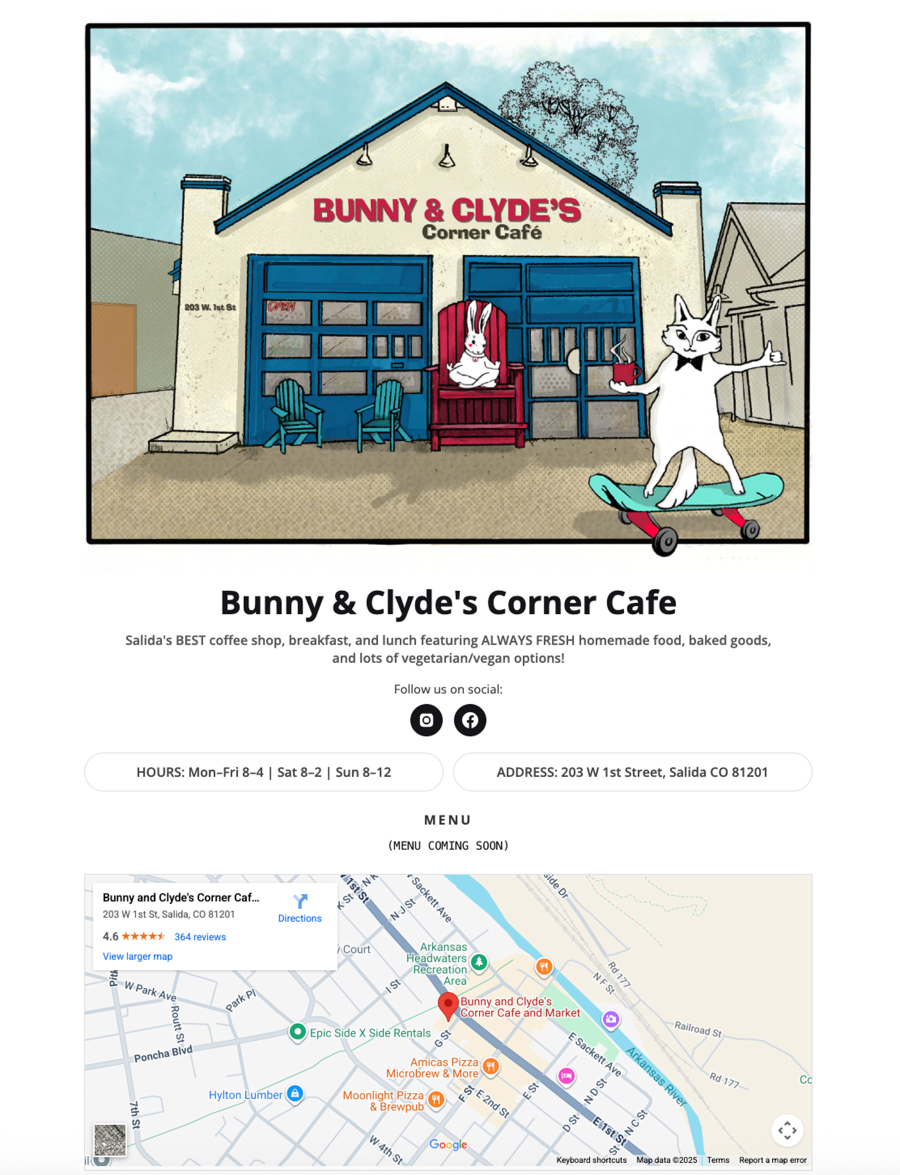 The client asked me to draw a custom illustration of the cafe (I had designed the logo years ago) and to build the "most minimal" website possible: illustration, contact info, menu, map.